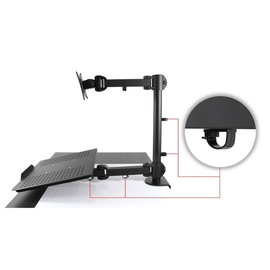 Držák notebooku nebo laptopu a monitoru Fiber Mounts FM23 Kvalitní sestava stolní držák na monitor 15-27" a držák na notebook laptop 13-17", polohovatelný, stabilní a pevný Vybavte si kancelář skvělým pomocníkem, který Vám uspoří spoustu místa a zlepší ergonomii při práci. Sestava Fiber Mounts FM23 obsahuje držák na monitory 15-27" a držák na notebooky nebo laptopy s úhlopříčkou 13-17". Držák monitoru podporuje VESA 75x75 a 100x100, lze ho otáčet do stran, naklápět, rotovat a výškově polohovat. Držák notebooku lze otáčet do stran a výškově polohovat. Barevné provedení černé, celková nosnost 20kg, celokovová konstrukce. Stolní držák na monitor a notebook do vaší kanceláře - Fiber Mounts FM23 Technické údaje: nosnost 20kg na monitory 15-27" na notebooky 13-17" VESA standard 75x75 a 100x100 otáčení do stran +/- 135° naklápění monitoru +/- 90° uchycení na stolové desky s tloušťkou 10-100mm barva černá záruka 3 roky Stolní držák na monitor a notebook do vaší kanceláře - Fiber Mounts FM23 Držák na monitory podporuje standardy VESA: VESA 75x75 VESA 100x100.