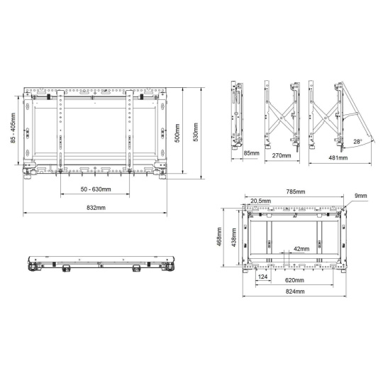 Technické údaje:  maximální zatížení 60kg na televizory a monitory s úhlopříčkou 40" až 65" VESA standart 100x100 až 600x400 nezávislé zavěšení každé obrazovky 8-polohové nastavení každé z obrazovek bez použití nářadí zasouvací mechanismus pro pohodlný přístup k obrazovkám možnost uzamčení zatahovacího mechanismu otevřená konstrukce držáku umožní snadný přístup k zapojení obrazovek profesionální konstrukce držáku eliminuje nutnost výpočtů pro realizaci montáže pružinový systém pro nastavení požadované tuhosti - v případě zavěšení obrazovek různých hmotností nejvyšší kvalita, špičkový nezávislý systém zavěšení barva černá záruka 5 let    Držák pro sestavu videostěny EDBAK VWPOP85-L podporuje VESA standardy:  VESA 100x100 VESA 200x100 a 100x200 VESA 200x200 VESA 300x200 a 200x300 VESA 300x300 VESA 400x200 a 200x400 VESA 400x300 a 300x400 VESA 400x400 VESA 600x400.