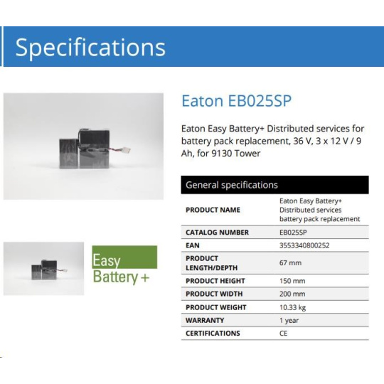 Eaton Easy Battery+ Distributed services for battery pack replacement, 36 V, 3 x 12 V / 9 Ah, for 9130 Tower