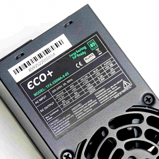 Napájecí zdroj TFX formátu s výkonem 250 W. Je osazen ventilátorem 80 mm, jehož otáčky jsou řízeny termoregulací. Zdroj vyhovuje požadavkům na elektrickou bezpečnost a elektromagnetickou kompatibilitu (EMC). Je vybaven elektronickými obvody, chránícími zdroj v případě přetížení/zkratu výstupu.
