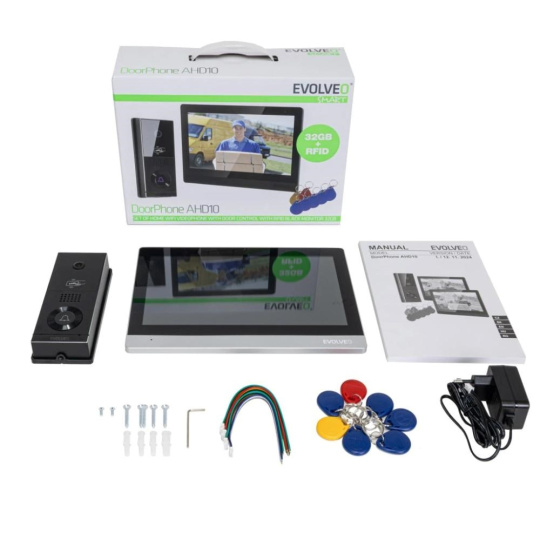 EVOLVEO DoorPhone AHD10, Sada domácího WiFi videotelefonu s ovládáním dveří a RFID, černo stříbrný 10" monitor, 32GB