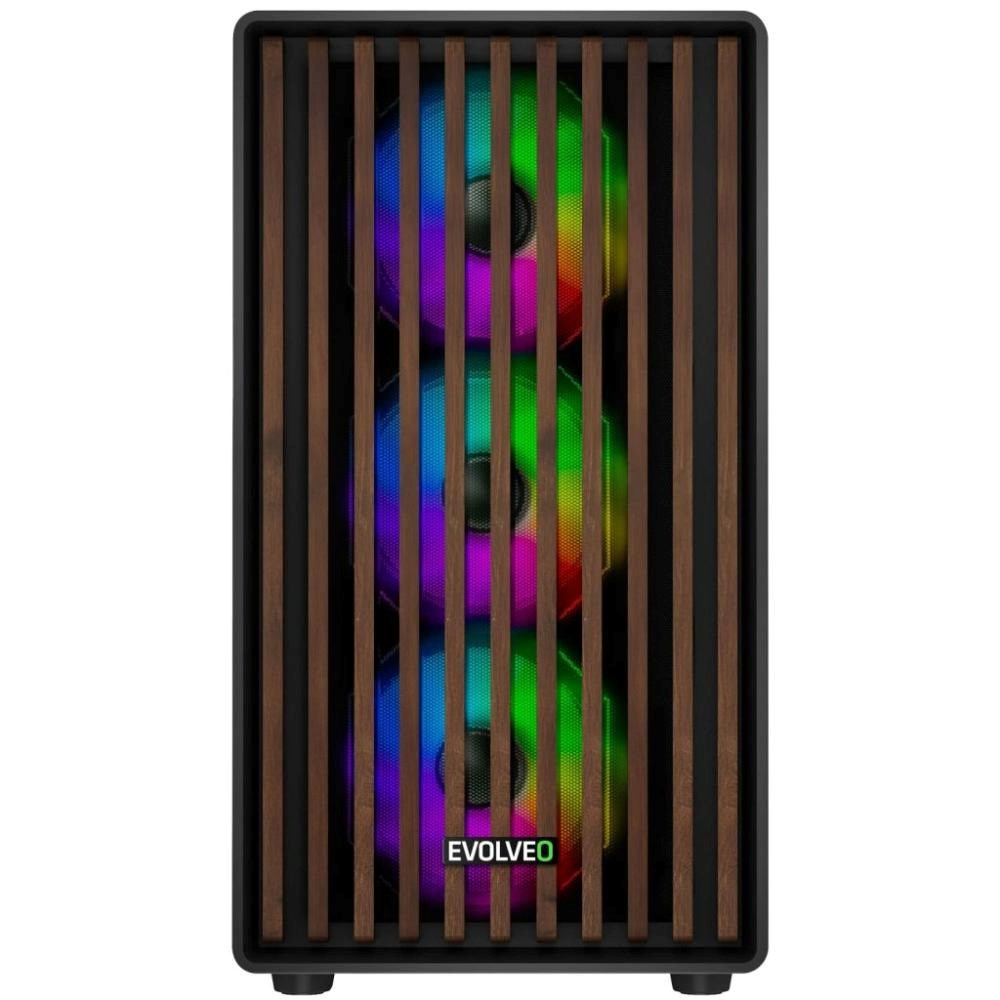 EVOLVEO Panthera, skříň mATX, 6x ARGB ventilátor 120mm, dřevěný přední panel + skleněná bočnice