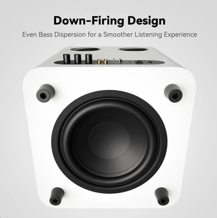 Aktivní subwoofer s 10" down-firing basovým reproduktorem, 200W Class-D zesilovač (špičkově až 500 W). Dvojité zadní bass-reflex porty, tuhá 14kg konstrukce. Vstupy: RCA a LFE. RCA výstup pro propojení dalšího subwooferu, nastavitelná fáze 0°–180°, crossover 40–180 Hz, dva DSP EQ režimy. Rozměry 36 × 36 × 40 cm. Součást balení: napájecí kabel 1,8 m, uživatelský manuál..