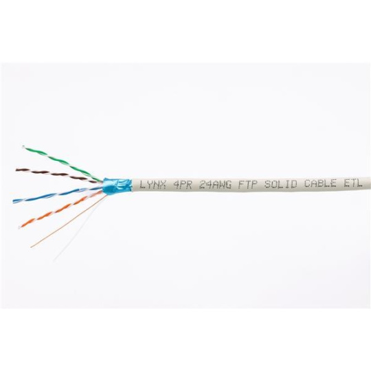 Stíněný instalační kabel LYNX Cat5E FTP je vhodný pro trvalé instalace ve vnitřních prostředích budov, staveb a ostatních zařízeních s vysokými elektromagnetickými vlivy. Kabel je vhodný pro přenosové rychlosti až 2,5 Gb/s. Kabel je vyroben z měděného drátu o průměru 0,50 mm s pláštěm z PVC a třídou reakce na oheň Eca.