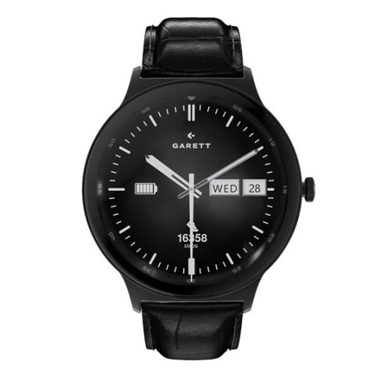- Sada obsahuje: smartwatch GARETT, náhradní kožený řemínek (černý / hnědý dle varianty), nabíjecí základna USB, QSG návod