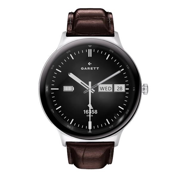 • Sada obsahuje: smartwatch GARETT, náhradní kožený řemínek (černý / hnědý dle varianty), nabíjecí základna USB, QSG návod