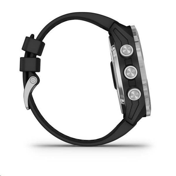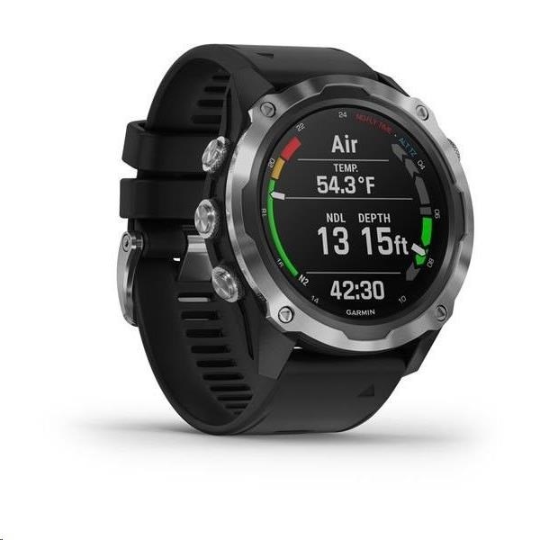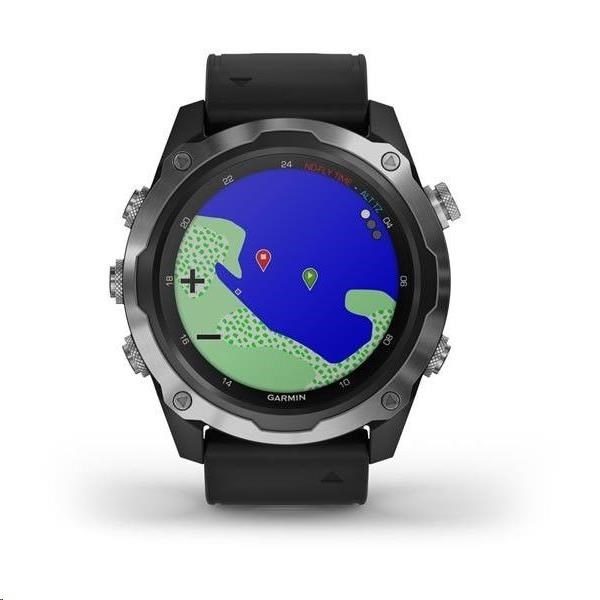 Potápěčský počítač s funkcemi chytrých a sportovně všestranných GPS hodinek, s mapami, MP3 hudbou a bezkontaktními platbami Garmin Pay. Safírové sklo, ocelová luneta, silikonový řemínek.