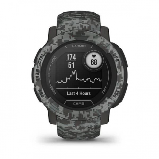 Hodinky Garmin Instinct 2 Camo jsou charakteristické svým osobitým vzhledem a výrazným kamuflážním vzorem. Jsou k dispozici vve dvou velikostech a více barevných variantách. Všechny varianty mají společné charakteristické vlastnosti jako nízkou hmotnost, vysoce kontrastní displej nebo extrémní výdrž a odolnost.