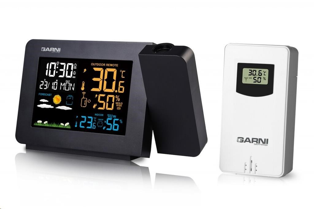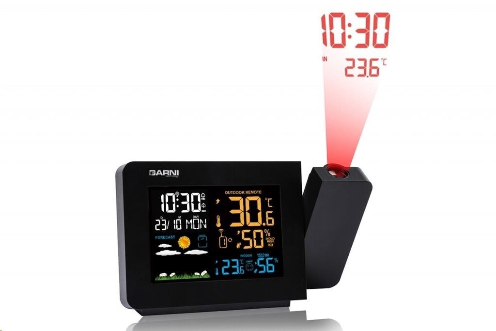 Meteorologická stanice se špičkovým inverzním barevným VA displejem s časem řízeným rádiovým signálem DCF-77, budíkem, měřením vnitřní teploty a relativní vlhkosti, bezdrátovým čidlem pro měření vnější teploty a relativní vlhkosti a projekcí času a vnitřní / venkovní teploty inverzní barevný VA displej o rozměrech 94 x 63 mm s možností stálého osvětlení 3 stupně jasu osvětlení displeje, možnost vypnutí osvětlení displeje s možností krátkodobého osvětlení na 15 s velikost číslic na displeji – čas 13 mm, datum, zkratka názvu dne 7 mm, vnitřní teplota a relativní vlhkost 10 mm, vnější teplota 20,5 mm, vnější relativní vlhkost 13 mm čas a datum řízené signálem DCF-77 s možností manuálního nastavení ikona příjmu signálu DCF-77 zkratka názvu dne 12ti, nebo 24 hodinový formát zobrazení času možnost nastavení časového pásma od -12 do +12 hodin budík s 2 budícími časy s funkcí opakovaného buzení (Snooze) nastavitelné od 5 do 60 minut budící signál - 10 sekund 1 pípnutí za sekundu, 10 sekund 2 pípnutí za sekundu, 10 sekund 3 pípnutí za sekundu a poté stále 4 pípnutí za sekundu střídavá projekce času a vnitřní a vnější teploty (teploty se střídají co 5 s) s možností otočení obrazu o 180°, možnost sklopení tubusu projektoru o 90° dopředu a dozadu barva projekce červená 2 stupně jasu a možnost vypnutí projekce 6 animovaných ikon předpovědi počasí (slunečno, polojasno, oblačno, srážky, silný déšť a sněžení) na základě sledování barometrického tlaku vestavěným barometrickým čidlem možnost nastavení výchozí ikony předpovědi počasí zobrazení hodnot vnitřní a vnější teploty a relativní vlhkosti paměť na maximální a minimální naměřené hodnoty teploty a rel. vlhkosti s automatickým mazáním v 0:00 hodin šipky tendence vývoje barometrického tlaku, vnitřní a vnější teploty a rel. vlhkosti 3 stupně indikace stavu vnitřní a vnější relativní vlhkosti indikace námrazy vnější teploty v rozsahu od -1°C do +3°C ikonou na displeji zobrazení teploty ve °C, nebo °F zobrazení hodnoty venkovního rosného bodu a teplotního indexu pro každý kanál možnost použití až 3 bezdrátových čidel GARNI 30H (jedno čidlo GARNI 030H je součástí dodávky) funkce automatického přepínání kanálů 5 ikon vnitřní tepelné pohody bezdrátový přenos hodnot vnější teploty a relativní vlhkosti na frekvenci 433 MHz ikona příjmu signálu bezdrátového čidla ikony slabých baterií napájení síťovým adaptérem a záložními bateriemi možnost postavení barva černá Bezdrátové čidlo GARNI 030H vlhkosti odolné displej o rozměrech 19 x 11 mm velikost číslic na displeji: teplota a relativní vlhkost 4 mm měření teploty a relativní vlhkosti 3 kanály maximální RF výkon 10 dBm (10 mW) možnost postavení a zavěšení barva bílá Obsah balení: 1 x hlavní jednotka GARNI 439 Line 1 x bezdrátové čidlo GARNI 030H 1 x síťový adaptér český, slovenský, německý, anglický, italský, polský a maďarský návod.