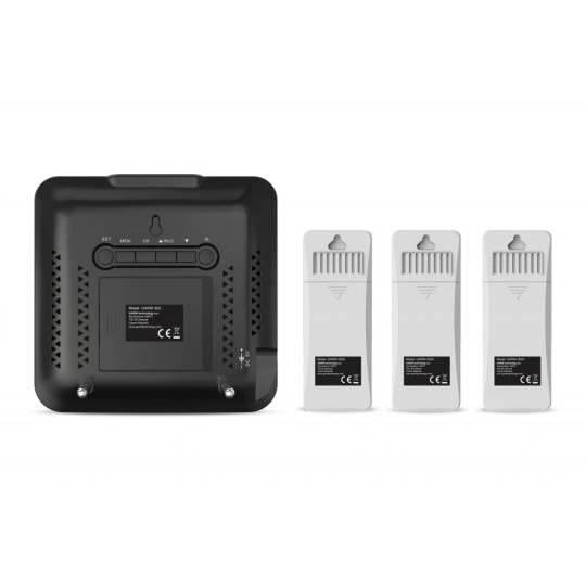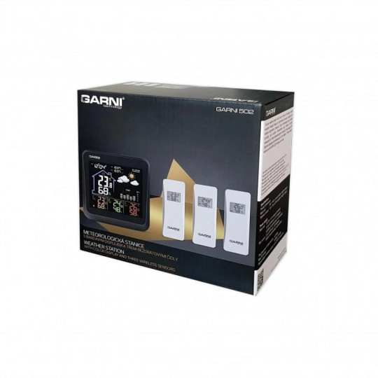 Meteorologická stanice se 3 bezdrátovými čidly pro měření vnější teploty a relativní vlhkosti, špičkovým inverzním barevným VA displejem s časem a datem řízenými rádiovým signálem DCF-77, budíkem, grafem, měřením vnitřní teploty, relativní vlhkosti a absolutního a relativního barometrického tlaku. Zobrazení všech měřených hodnot na displeji současně. špičkový inverzní barevný VA displej o rozměrech 106 x 94 mm s možností stálého osvětlení při napájení síťovým adaptérem, nebo krátkodobým osvětlením na 10 s při napájení bateriemi tři stupně jasu osvětlení displeje (při napájení síťovým adaptérem) a možnost vypnutí osvětlení displeje velikost číslic na displeji – čas, datum 7 mm, vnitřní teplota 21 mm, vnitřní relativní vlhkost 14 mm, vnější teplota 12,5 mm, vnější relativní vlhkost 10 mm, barometrický tlak 4,5 mm barvy na displeji: čas, barometrický tlak, vnitřní teplota a rel. vlhkost, graf bílá, teplota a rel. vlhkost na kanálu č.1 žlutá, na kanálu č.2 zelená a na kanálu č.3 oranžová čas a datum řízené signálem DCF-77 s možností manuálního nastavení ikona příjmu signálu DCF-77 12ti, nebo 24 hodinový formát zobrazení času možnost nastavení časového pásma od -12 do +12 hodin budík s funkcí opakovaného buzení (Snooze) po 5 minutách budící signál - 10 sekund 1 pípnutí za sekundu, 10 sekund 2 pípnutí za sekundu, 10 sekund 4 pípnutí za sekundu a poté stálé pípání 5 ikon předpovědi počasí (jasno, polojasno, oblačno, srážky (déšť), srážky (sněžení) na základě sledování barometrického tlaku vestavěným barometrickým čidlem možnost nastavení výchozí ikony předpovědi počasí zobrazení hodnot vnitřní a vnější teploty a relativní vlhkosti ze všech 3 čidel současně zobrazení teploty ve °C, nebo °F zobrazení barometrického tlaku absolutního a relativního (hPa/mb nebo mmHg) možnost nastavení hodnoty relativního barometrického tlaku graf vývoje bar. tlaku, vnitřní a vnější teploty na všech třech kanálech za uplynulých 12 hodin paměť na maximální a minimální naměřené hodnoty teploty a rel. vlhkosti 3 ikony vnitřní tepelné pohody 3 bezdrátová čidla GARNI 052H jsou součástí balení bezdrátový přenos hodnot vnější teploty relativní vlhkosti na frekvenci 433 MHz ikona slabých baterií hlavní jednotky a venkovních čidel napájení hlavní jednotky síťovým adaptérem nebo bateriemi délka kabelu síťového adaptéru 1,80 m možnost postavení, nebo zavěšení barva černá Bezdrátové čidlo GARNI 052H vlhkosti odolné displej o rozměrech 25 x 12 mm velikost číslic na displeji: teplota 7 mm a relativní vlhkost 6 mm měření teploty a relativní vlhkosti 3 kanály maximální RF výkon 10 dBm (10 mW) možnost postavení, nebo zavěšení barva bílá Obsah balení: 1 x hlavní jednotka GARNI 502 3 x bezdrátové čidlo GARNI 052H 1 x síťový adaptér český, slovenský, německý, anglický, polský, maďarský a nizozemský návod.