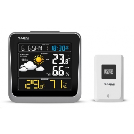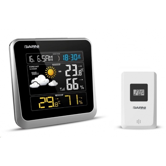 Meteorologická stanice se špičkovým inverzním barevným VA displejem s časem a datem řízenými rádiovým signálem DCF-77, budíkem, měřením vnitřní teploty, relativní vlhkosti a absolutního barometrického tlaku a bezdrátovým čidlem pro měření vnější teploty a relativní vlhkosti. - špičkový inverzní barevný VA displej o rozměrech 106 x 94 mm s možností stálého osvětlení při napájení síťovým adaptérem, nebo krátkodobým osvětlením na 10 s při napájení bateriemi - tři stupně jasu osvětlení displeje (při napájení síťovým adaptérem) - velikost číslic na displeji – čas, datum a zkratka názvu dne 10 mm, vnitřní teplota a relativní vlhkost - 17 mm, vnější teplota a relativní vlhkost 19 mm, barometrický tlak 4,5 mm - čas a datum řízené signálem DCF-77 s možností manuálního nastavení - ikona příjmu signálu DCF-77 - 12ti, nebo 24 hodinový formát zobrazení času - možnost nastavení časového pásma od -12 do +12 hodin - budík pro buzení každý den, nebo v pracovní dny s funkcí opakovaného buzení (Snooze) po 5 minutách - budící signál - 10 sekund 1 pípnutí za sekundu, 10 sekund 2 pípnutí za sekundu, 10 sekund 4 pípnutí za sekundu a poté stálé pípání - 6 ikon předpovědi počasí (jasno, polojasno, oblačno, srážky (déšť), srážky (sněžení), přívalové srážky) na základě sledování barometrického tlaku vestavěným barometrickým čidlem - zobrazení hodnot vnitřní a vnější teploty a relativní vlhkosti - šipky vývoje teploty, relativní vlhkosti - alarm horní a dolní meze venkovní teploty v rozsahu od -40°C do +70°C a to pro každý kanál zvlášť. - měření absolutního barometrického tlaku (hPa/mb nebo mmHg) - zobrazení teploty ve °C, nebo °F - paměť na maximální a minimální naměřené hodnoty teploty a rel. vlhkosti s automatickým nulováním ve 0:00 hodin - možnost použití až 3 bezdrátových čidel GARNI 045H (jedno čidlo je součástí dodávky) - funkce automatického přepínání kanálů na kterých jsou bezdrátová čidla přihlášená po 5 s - bezdrátový přenos hodnot vnější teploty relativní vlhkosti na frekvenci 433 MHz - zobrazení fáze Měsíce - ikona slabých baterií hlavní jednotky a venkovního čidla - napájení hlavní jednotky síťovým adaptérem nebo bateriemi - délka kabelu síťového adaptéru 1,75 m - možnost postavení, nebo zavěšení - barva černá se stříbrným rámečkem Bezdrátové čidlo GARNI 045H - displej o rozměrech 18 x 10 mm - velikost číslic na displeji: teplota 4 mm a relativní vlhkost 3,5 mm - měření teploty a relativní vlhkosti - možnost postavení, nebo zavěšení - barva bílá Obsah balení: 1 x hlavní jednotka GARNI 525 1 x bezdrátové čidlo GARNI 045H 1 x síťový adaptér český, slovenský, německý, anglický, polský, maďarský a italský návod.