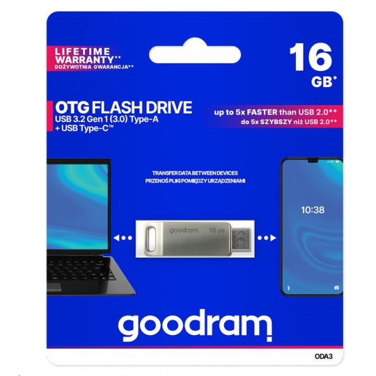 Type-C™ is becoming the most popular USB type used to transfer data between all electronic devices. The growing popularity of this solution is supported by the fact that manufacturers of next gen laptops, smartphones, PCs and other devices are increasingly equipping their products with an additional “C” next to the standard type A connector or choose only Type-C™. GOODRAM OTG ODA is an excellent solution that will work both with an old and new electronic devices generation laptops, smartphones and PCs. The ODA Flash drive is equipped with two fast USB 3.2 connectors: one standard type A and the Type-C™, which means that data transfer between devices of different generations has never been so easy and fast.