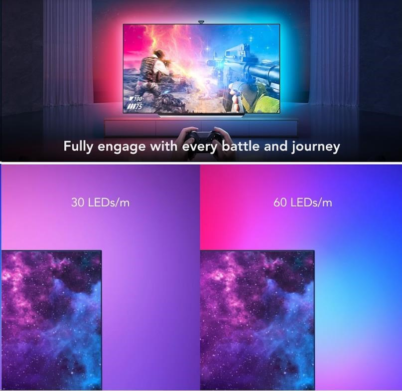 Vylepšete své herní, filmové a hudební zážitky s živým chytrým osvětlením Govee DreamView T2. 16 milionů barev s více než 99 režimy efektů, z toho 4 režimy pro synchronizaci s hudbou, povznese zážitek ze sledování televize nebo hraní her na novou úroveň díky SMART technologii ColorMatch, která snímá obrazovku revoluční duální kamerou a automaticky podle toho upravuje nastavení světel. Ovládají se hlasem přes Siri, Amazon Alexa nebo Google Assistant, přes aplikaci nebo Control box. Nebudete proto ani muset stávat z gauče. Barevné podsvícení opticky zvětšuje obraz a také šetří vaše oči.