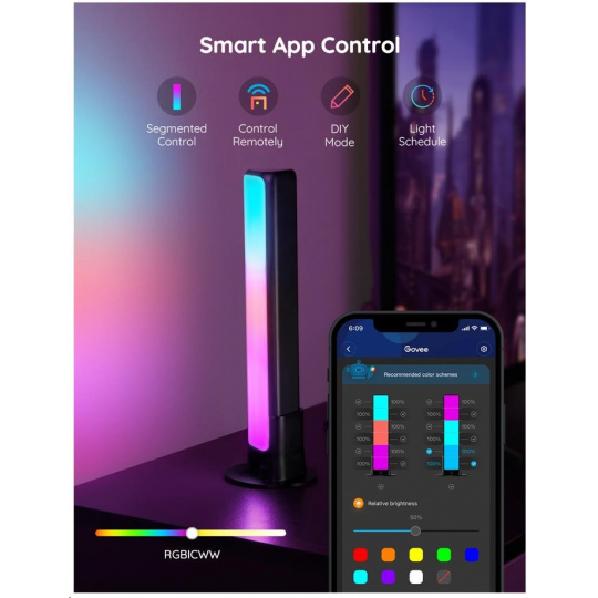 Spravujte nastavení barev a intenzity světla jednoduše pomocí aplikace Govee Home. Aplikace je zdarma ke stažení v Google Play a AppStore. Navíc získáte přístup k funkci časovače, DIY barvám, režimu videa, synchronizaci hudby a režimům scény. Světlo je možné ovládat i přímo na dodávaném Control boxu.