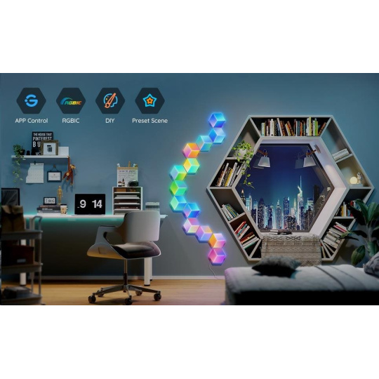 Vylepšete interiér a herní, filmové a hudební zážitky s designovým světlem Hexa PRO 3D Smart LED. Díky technologii RGBIC zobrazuje až 57 barev najednou. Barevnost si můžete nastavit po jednotlivých sekcích a kreativně si pohrát s 3D efektem osvětlení. Celkově umí zobrazit až 16 milionů barev s intenzitou 1-100%. Určitě si vyberete z mnoha režimů osvětlení a při poslouchaní oblíbené hudby si můžete zvolit také ze 6 rytmických režimů. Světla se ovládají hlasem přes Siri, Amazon Alexa nebo Google Assistant nebo přes aplikaci Govee Home na chytrém telefonu nebo tabletu. Světlo je určeno na instalaci na zeď a jeho tvar si můžete přizpůsobit podle vlastní fantazie. Jednoduchá instalace bez vrtání s životností až 50.000 hodin.