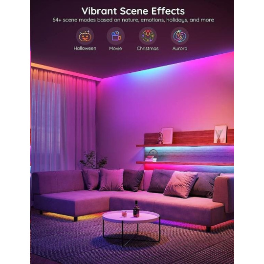 Tyto chytré LED pásky Govee nabízí více než 64 různých režimů pro dokonalé naladění světelné atmosféry. Díky technologii RGBIC umí zobrazit 16 milionů barev a nastavit intenzitu osvětlení od 1-100 %. Životnost je až 50.000 hodin.