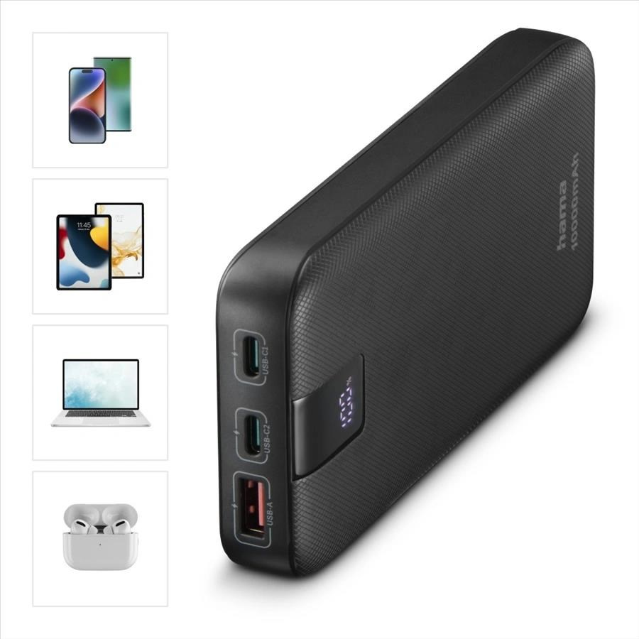 Hama PD 10 powerbanka, 10000 mAh, PD, Qualcomm, 3 výstupy: 2x USB-C, 1x USB-A, LED displej