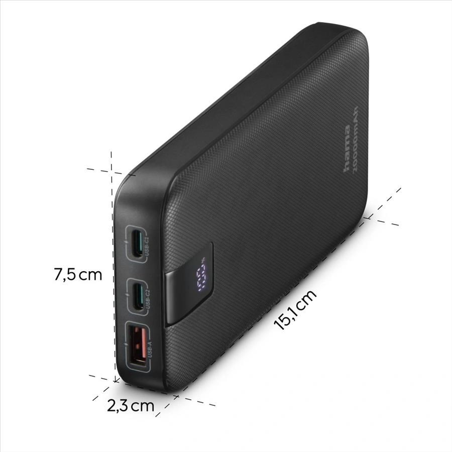 Hama PD 20 powerbanka, 20000 mAh, PD, Qualcomm, 3 výstupy: 2x USB-C, 1x USB-A, LED displej,