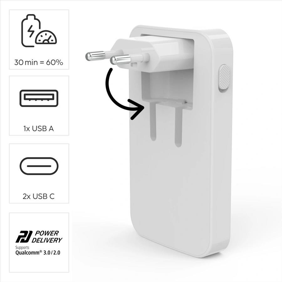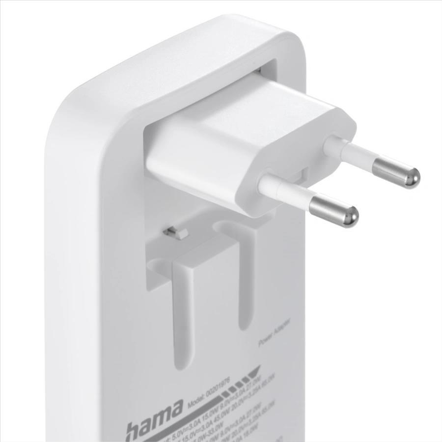Hama rýchla USB nabíjačka GaN 2x USB-C + USB-A, PD/QC 65 W, plochá, skladacia
