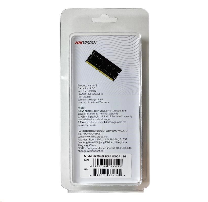 Hikvision memory moudule S1 is a DDR4 memory,which is manufactured by using original high-quality granules and mature production technology to make it more compatible, work stable and cos-etffective. It can be widely used in notebook computer installation.