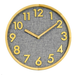 • analogové nástěnné hodiny • čas řízený krystalem • materiál kompozitní dřevo • průměr ciferníku 300 mm • napájení 1 ks baterie typ AA 1,5 V (tužková, není součástí balení) • ciferník látka, číslice s dřevěným vzorem.