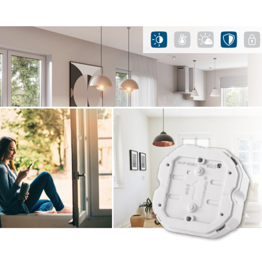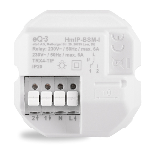 Spínací akční člen (HmIP-BSM-I) se montuje do standardní zápustné elektroinstalační krabice pod omítku s připojením do sítě 230 V. Bezdrátová komunikace nabízí možnost instalace bez potřeby druhotné kabeláže. To znamená, že akční člen lze umístit v místě připraveného nebo stávajícího elektrického rozvodu sítě 230 V.