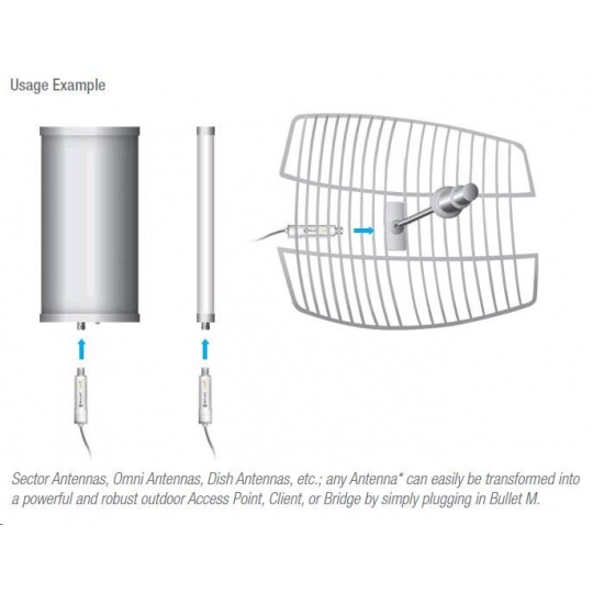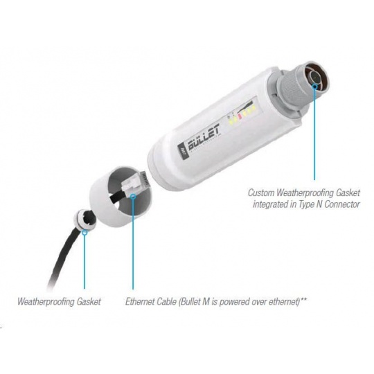 Bullet M2 HP je miniaturním a nejrychlejším 2,4GHz outdoorovým klientem, který lze jednoduše připevnit přímo k anténě. Tím odpadá potřeba použití ztrátového koaxiálního kabelu! Díky integrovanému ukazateli intenzity signálu lze přímo na místě správně nasměrovat klientskou anténu. Vysoká přenosová rychlost (až 100 Mbps) je dosažena díky podpoře standardu 802.11n a to za použití pouze jedné antény. Od starších verzí Bulletů se liší také vyšším výkonem procesoru, větší pamětí a vysokou citlivostí bezdrátové části.