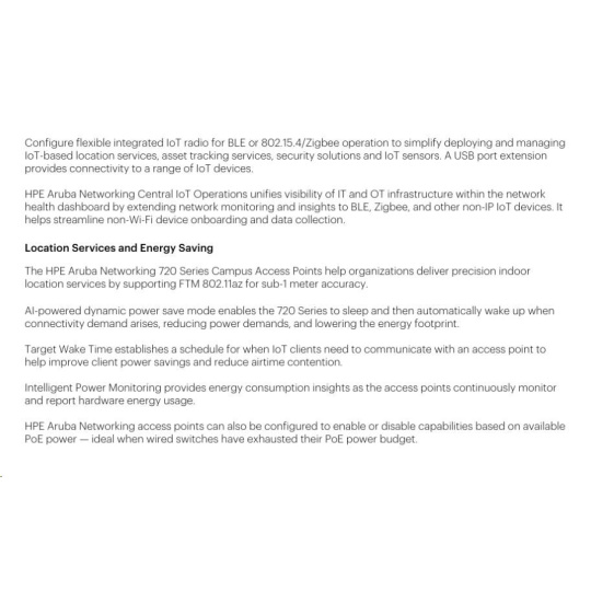 The HPE Aruba Networking 720 Series Campus Access Points includes an integrated Bluetooth 5.4 or 802.15.4 radio for Zigbee support to simplify deploying and managing IoT-based location services, asset tracking services, security solutions, and IoT sensors. There is also a USB host port to provide IoT connectivity to a wider range of devices.