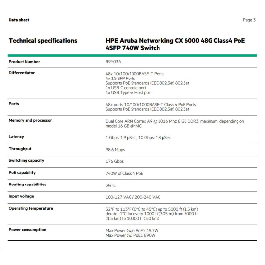 HPE Aruba Networking CX 6000 48G Class4 PoE 4SFP 740W Switch.