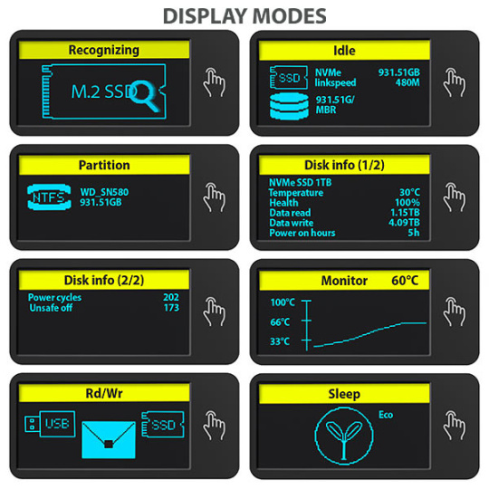 Box je vybaven pokročilým LED displejem, který poskytuje okamžitý přehled o stavu vašeho disku. Nabízí několik režimů zobrazení, včetně detekce připojeného disku, použitého systémového souboru, teploty, zdraví disku, rychlosti přenosu dat a pracovních hodin. Detailní graf umožňuje sledování teploty disku v reálném čase, zatímco režim spánku šetří energii při nečinnosti. S tímto inteligentním monitoringem budete mít svůj disk vždy pod kontrolou - jednoduše, přehledně a efektivně.
