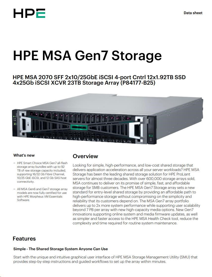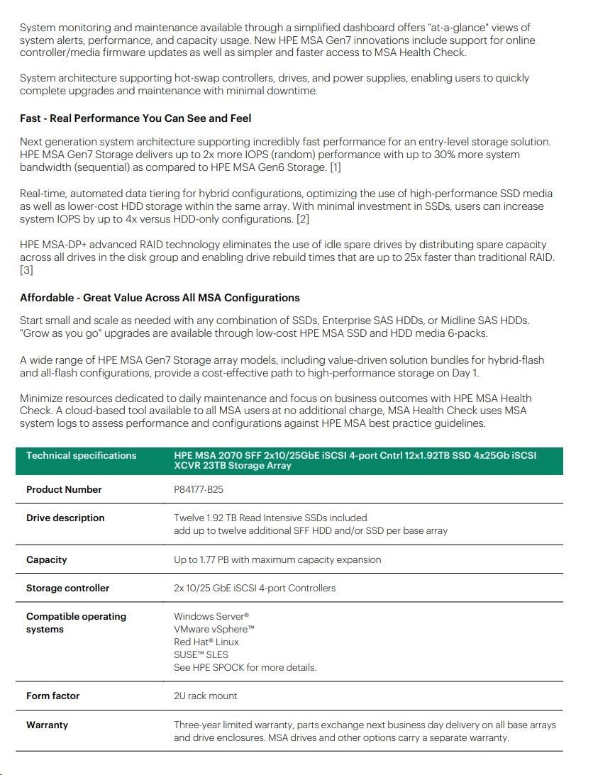 HPE MSA 2070 SFF 2x10/25GbE iSCSI 4-port Controller 12x1.92TB SSD 4x25Gb iSCSI XCVR 23TB Storage Array Smart Choice.