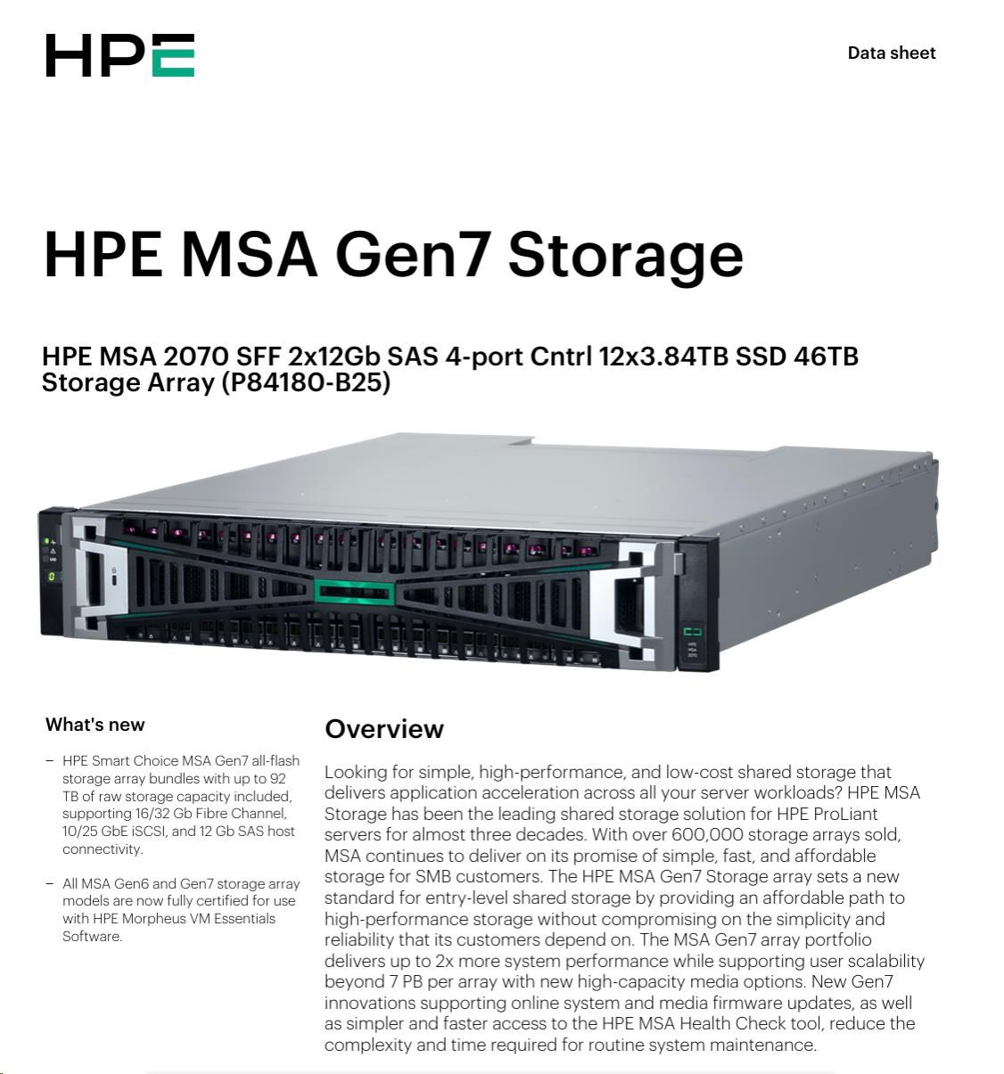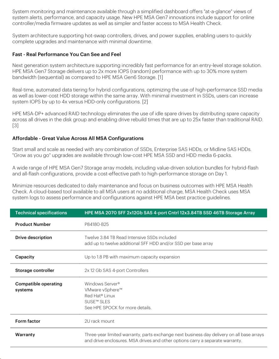 HPE MSA 2070 SFF 2x10/25GbE iSCSI 4-port Controller 12x3.84TB SSD 4x25Gb iSCSI XCVR 46TB Storage Array Smart Choice.