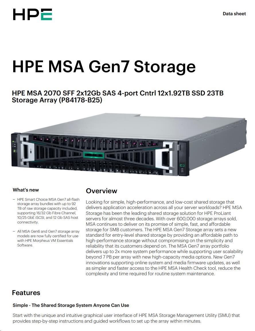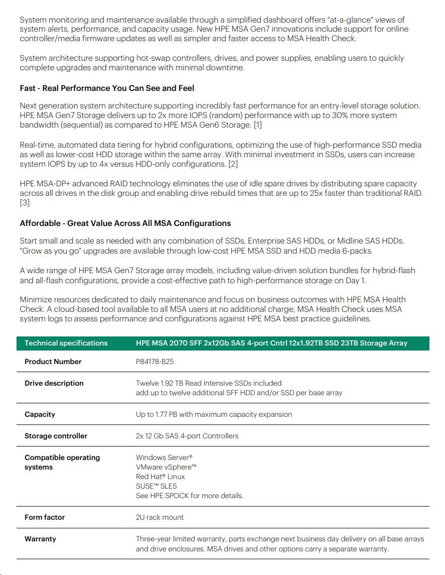 HPE MSA 2070 SFF 2x12Gb SAS 4-port Controller 12x1.92TB SSD 23TB Storage Array Smart Choice.