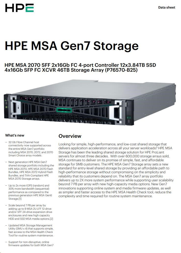 HPE MSA 2070 SFF 2x16Gb FC 4-port Controller 12x3.84TB SSD 4x16Gb SFP FC XCVR 46TB Storage Array