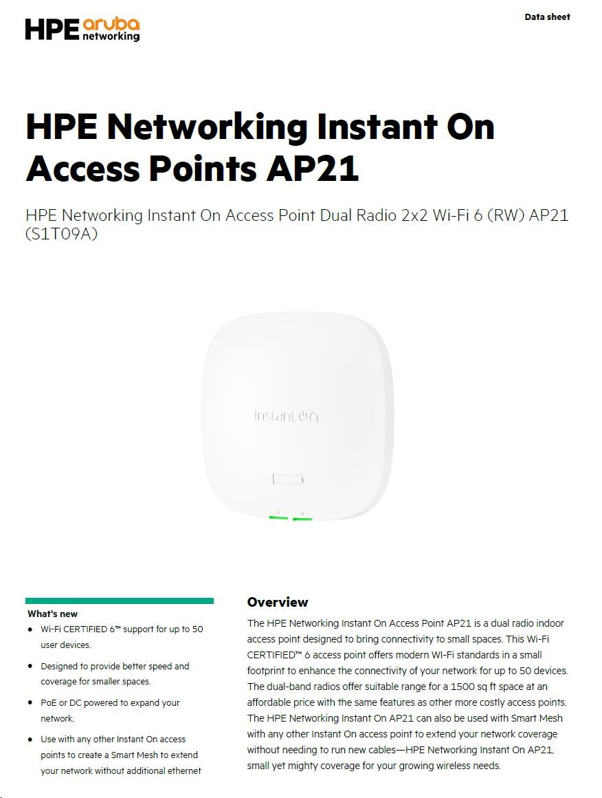 - The HPE Networking Instant On Access Point AP21 is a dual radio indoor access point designed to bring connectivity to small spaces. This Wi-Fi CERTIFIED™ 6 access point offers modern WI-Fi standards in a small footprint to enhance the connectivity of your network for up to 50 devices. The dual-band radios offer suitable range for a 1500 sq ft space at an affordable price with the same features as other more costly access points. The HPE Networking Instant On AP21 can also be used with Smart Mesh with any other Instant On access point to extend your network coverage without needing to run new cables—HPE Networking Instant On AP21, small yet mighty coverage for your growing wireless needs.