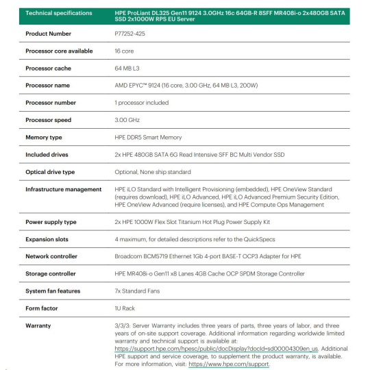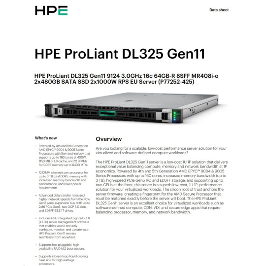 HPE ProLiant DL325 Gen11 9124 3.0GHz 16c 64GB-R 8SFF MR408i-o 2x480GB SATA SSD 2x1000W RPS EU Server