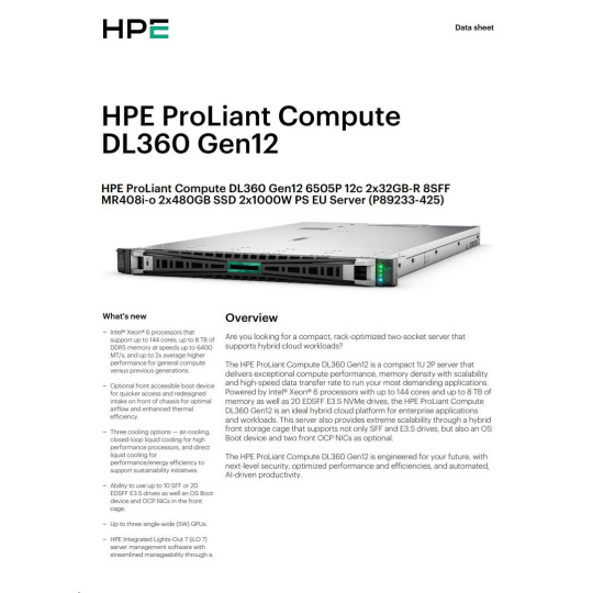 HPE PL DL360 Gen12 6505P (2.2/12C) 2x32G (P69727) 2x480G MR408i-o 8SFF 2x1000W 10GbE NBD333 Smart ChoicePE ProLiant Compute DL320 Gen12 Datasheet