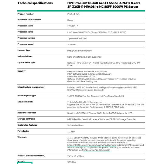 Model Name HPE PL DL360g11 5515+ (3.2/8C/165W) 1x32G MR408i-o/4G 8-10SFF 1x1000W 2x10G-T NBD333 1U