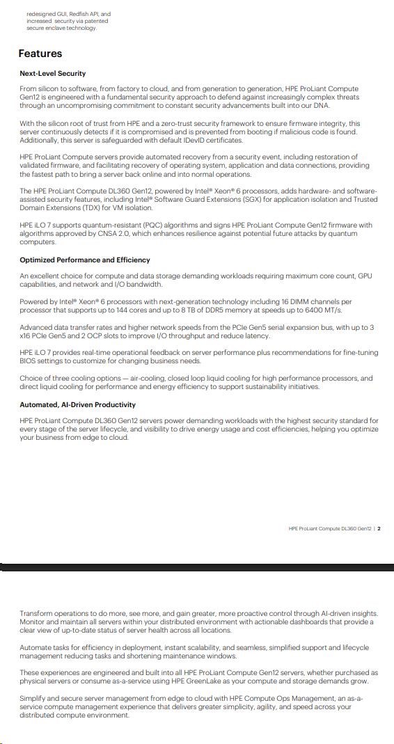 The HPE ProLiant Compute DL360 Gen12 is a compact 1U, two-socket server designed for hybrid cloud workloads. Powered by Intel® Xeon® 6 processors supporting up to 144 cores and up to 8 TB DDR5 memory (up to 6400 MT/s), it delivers exceptional compute performance, scalability, and high-speed data transfer.