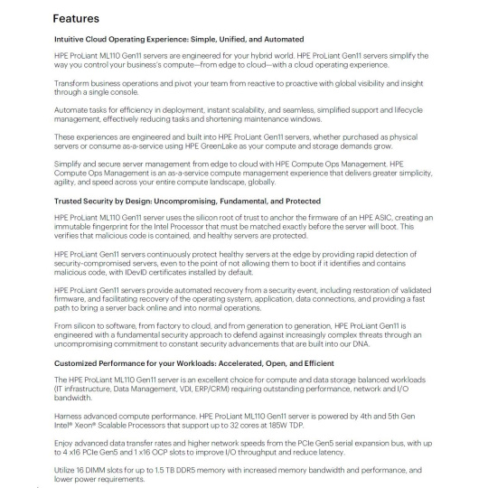 | Chassis | HPE ProLiant ML110 Gen11 SFF Configure-to-order Server |