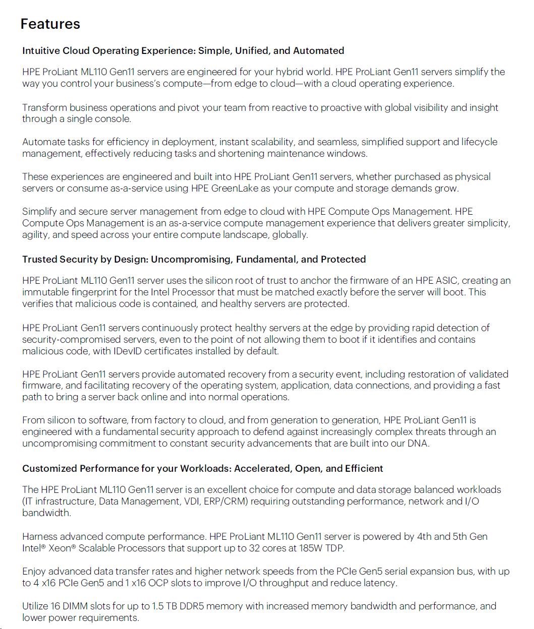 | Model Name | HPE ProLiant ML110 Gen11 3508U 2.1GHz 8c 1P 1x32GB-R 8SFF 2x480GB SSD 2x1000W PS EU Server |