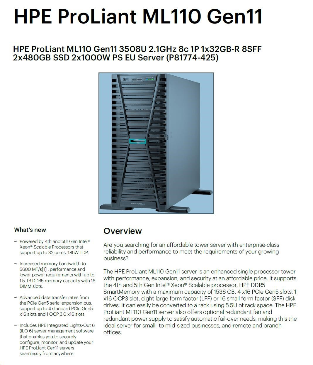 | Chassis | HPE ProLiant ML110 Gen11 SFF Configure-to-order Server |