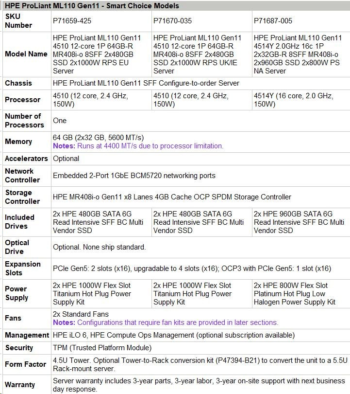 | Chassis | HPE ProLiant ML110 Gen11 SFF Configure-to-order Server |