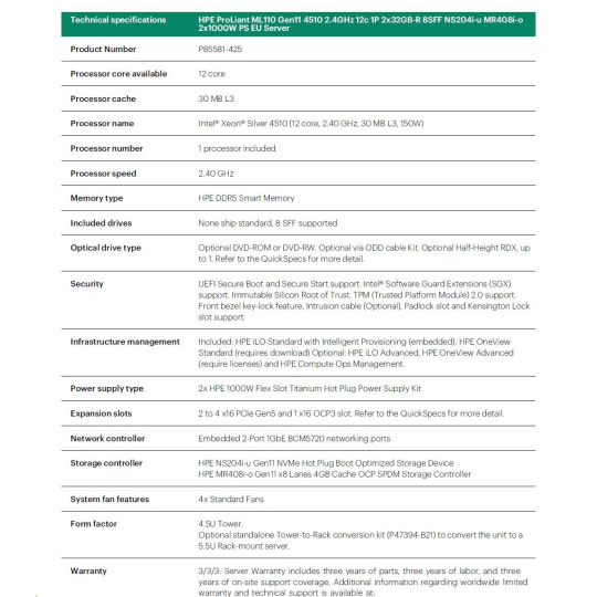 HPE PL ML110g11 4510 (2.4G/12C) NS204(2x480) 2x32G (P64706) MR408i-o 2x1000W 8SFF 2x1G NBD333 Smart Choice