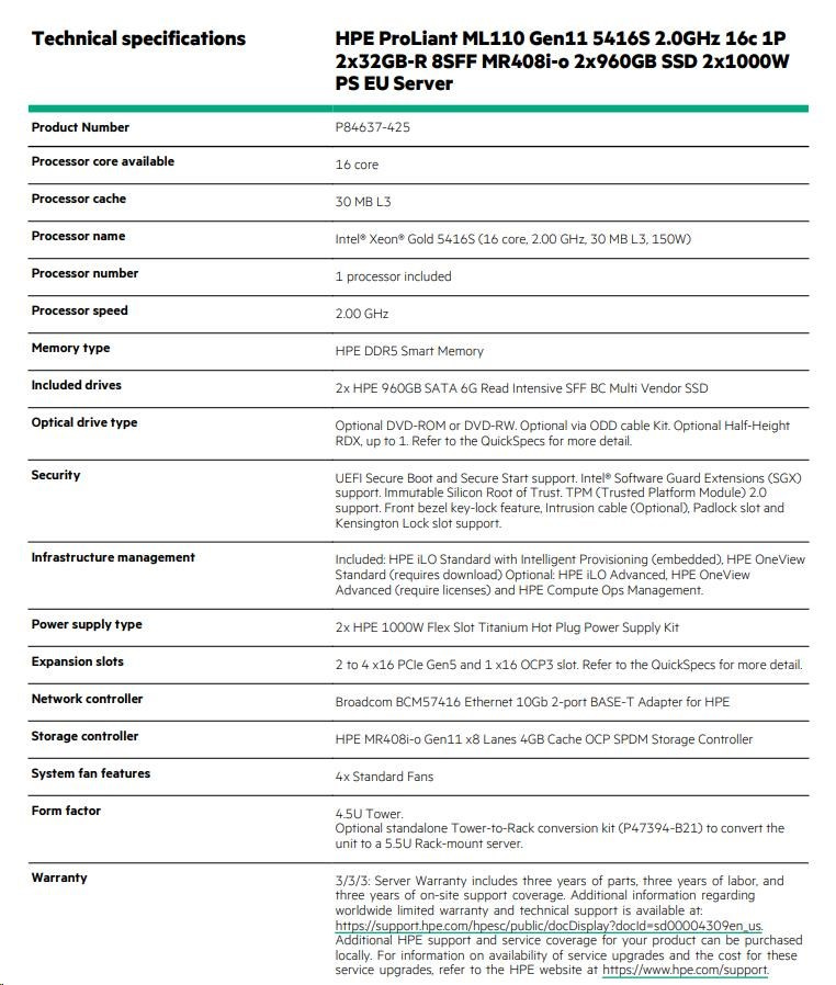 | Chassis | HPE ProLiant ML110 Gen11 SFF Configure-to-order Server |