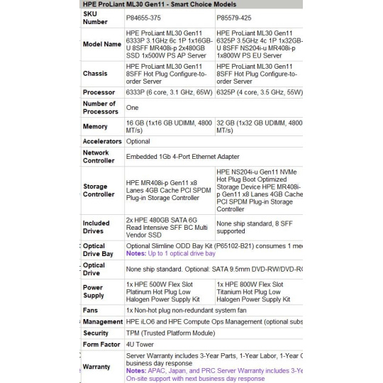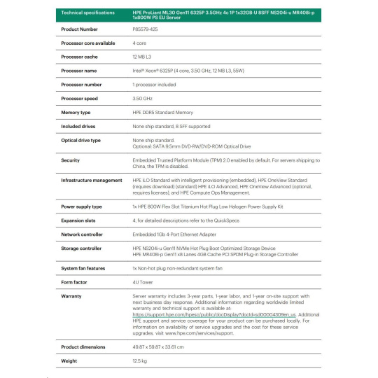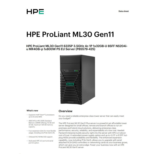 HPE PL ML30g11 6325P (3.5G/4C8T) 1x32G 8SFF NS204i-u(2x480g) MR408i-p/4G 2x800W 3/1/1 Smart Choice.
