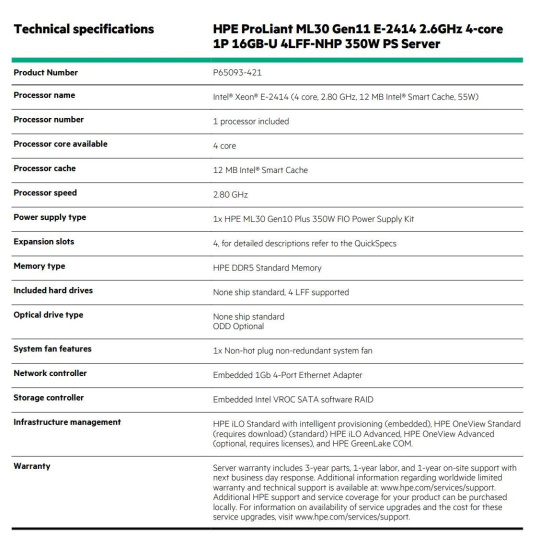 Model nameHPE PL ML30g11 E-2414 (2.6G/4C8T) 16G (P64336) 4LFF NHP VROC 350Wn NBD311