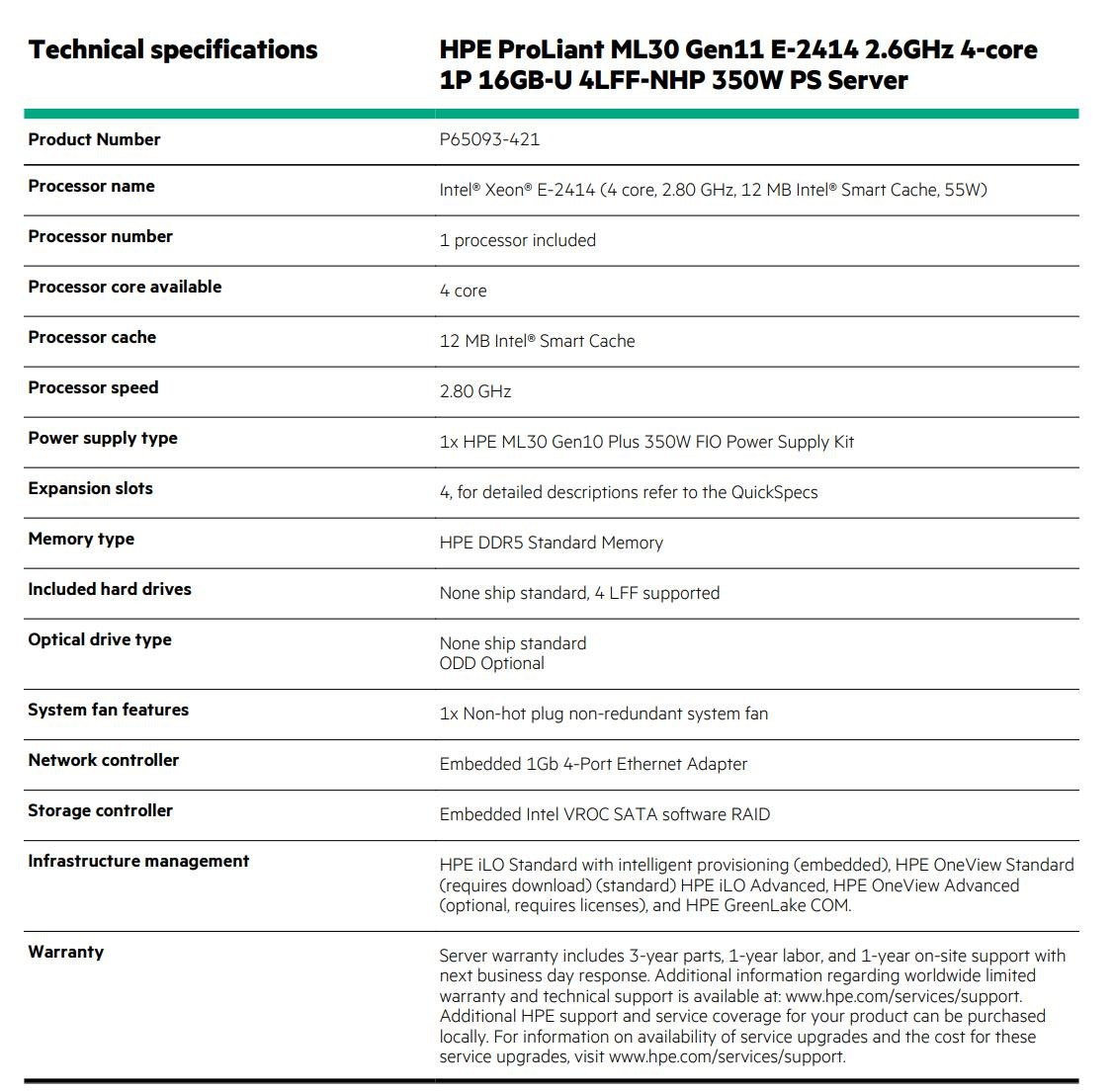 Model nameHPE PL ML30g11 E-2414 (2.6G/4C8T) 16G (P64336) 4LFF NHP VROC 350Wn NBD311