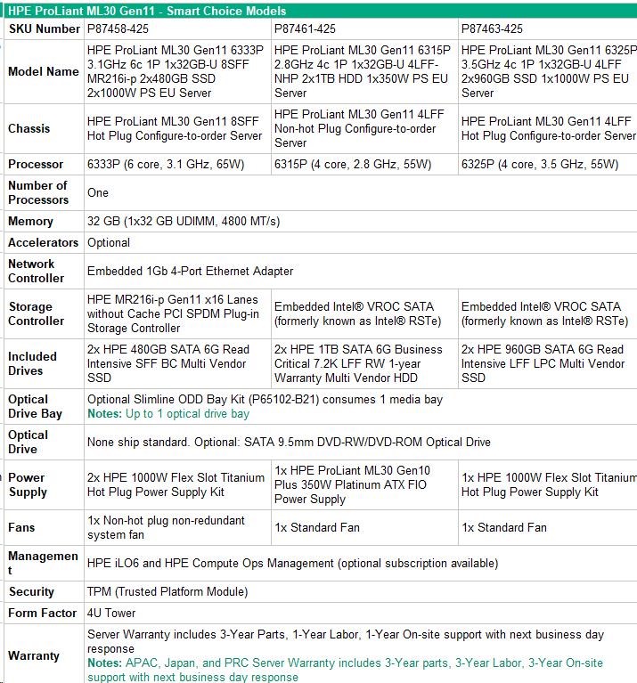 HPE PL ML30g11 6315P (2.8G/4C4T) 1x32G 2x1TB SATA 4LFF-NHP 1x350 VROC 4p1G NBD311 Smart Choice.