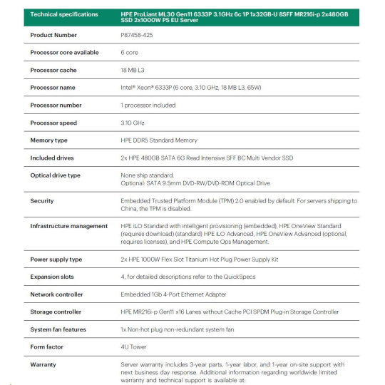 HPE PL ML30g11 6333P (3.1-5.1G/6C12T/65W) 1x32G 2x480G 2x1000W MR216i-p 8SFF 4p1G NBD311 Smart Choice